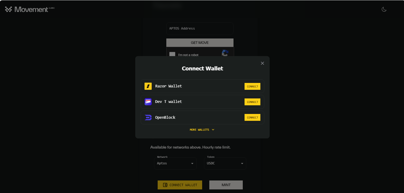 dApps deployed on these chains are compatible with Razor wallet. Let’s demonstrate this using the Movement Faucet for MEVM.