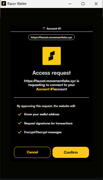 - Your wallet will request permission to connect to the Movement Faucet.