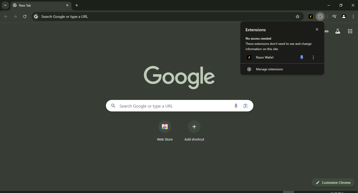 Our wallet is compatible with Chrome, Brave, Opera, Edge, and other Chromium-based browsers. You can install the Chrome extension for Razor by following this link or here.