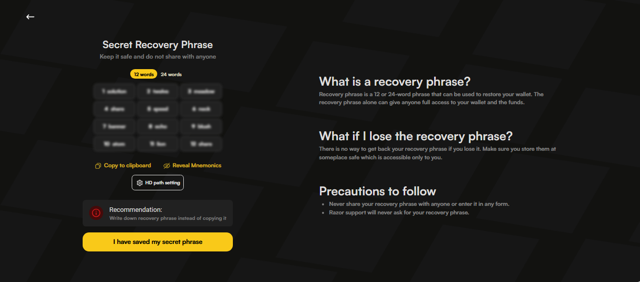 - Click “I have saved my secret phrase” once you have noted it down.
